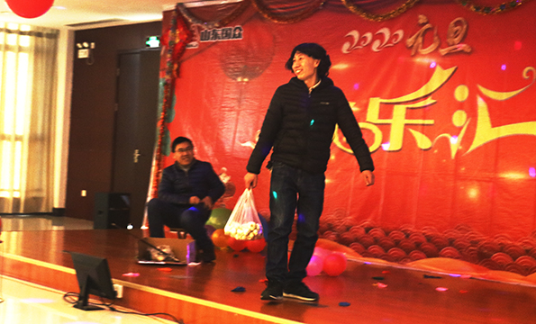 歡樂匯以“開球見喜”為主線,員工上場開球以隨機的形式抽取,開小球表演簡單的小節(jié)目,無需準(zhǔn)備,簡單新穎,比如,員工劉壽山開球開出——走模特步,讓他頗為難為情,跟著女主持一起模仿模特步,引得員工笑顏頓開;開大球,員工表演各種節(jié)目。匯場上,新年的歡樂氛圍火爆,員工舒心快樂的表演節(jié)目,王旭東、徐可的《沙漠駱駝》,以明快的節(jié)奏激活了歡悅的氛圍;杜杰的幽默表演——《中國功夫》,以粗狂的武術(shù),給大家?guī)砹苏鸷常痪狭值囊磺氉唷睹飨拑河浶纳稀?,給大家?guī)Щ氐矫珷敔敃r代的回憶中去;李寧演唱的《在哪遙遠的地方》,可謂聲情并茂,唱出了遙遠地方姑娘的美麗與善良;陳爍帶來的魔術(shù)表演,新穎活躍,調(diào)節(jié)了匯場的氛圍,給大家新奇的感覺,也展現(xiàn)了陳爍機智和風(fēng)趣的個性;幽默滑稽的小品《如此問價》,給大家?guī)砹藲g悅,也將元旦佳節(jié)的喜慶氛圍推上了新的高潮;員工顏彬的一曲《家住臨沂》,道出了沂蒙人民熱愛家鄉(xiāng)的昂揚情結(jié);孟祥松、盧元福等員工的大合唱《我的未來不是夢》,唱出了員工的心聲,展露出國眾員工熱愛生活,追求美好前程的精神面貌;趙桂基、高珩超表演的相聲《求職趣事》讓匯場的氛圍更加火爆。