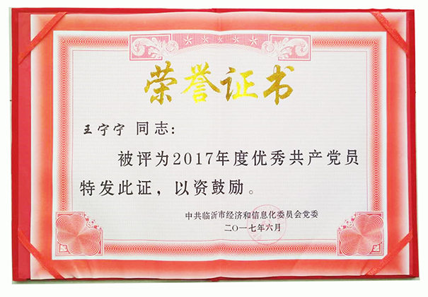 2017年6月,公司優(yōu)秀共產(chǎn)黨員王寧寧同志,被臨沂市經(jīng)濟和信息化委員會黨委授予優(yōu)秀共產(chǎn)黨員榮譽稱號。